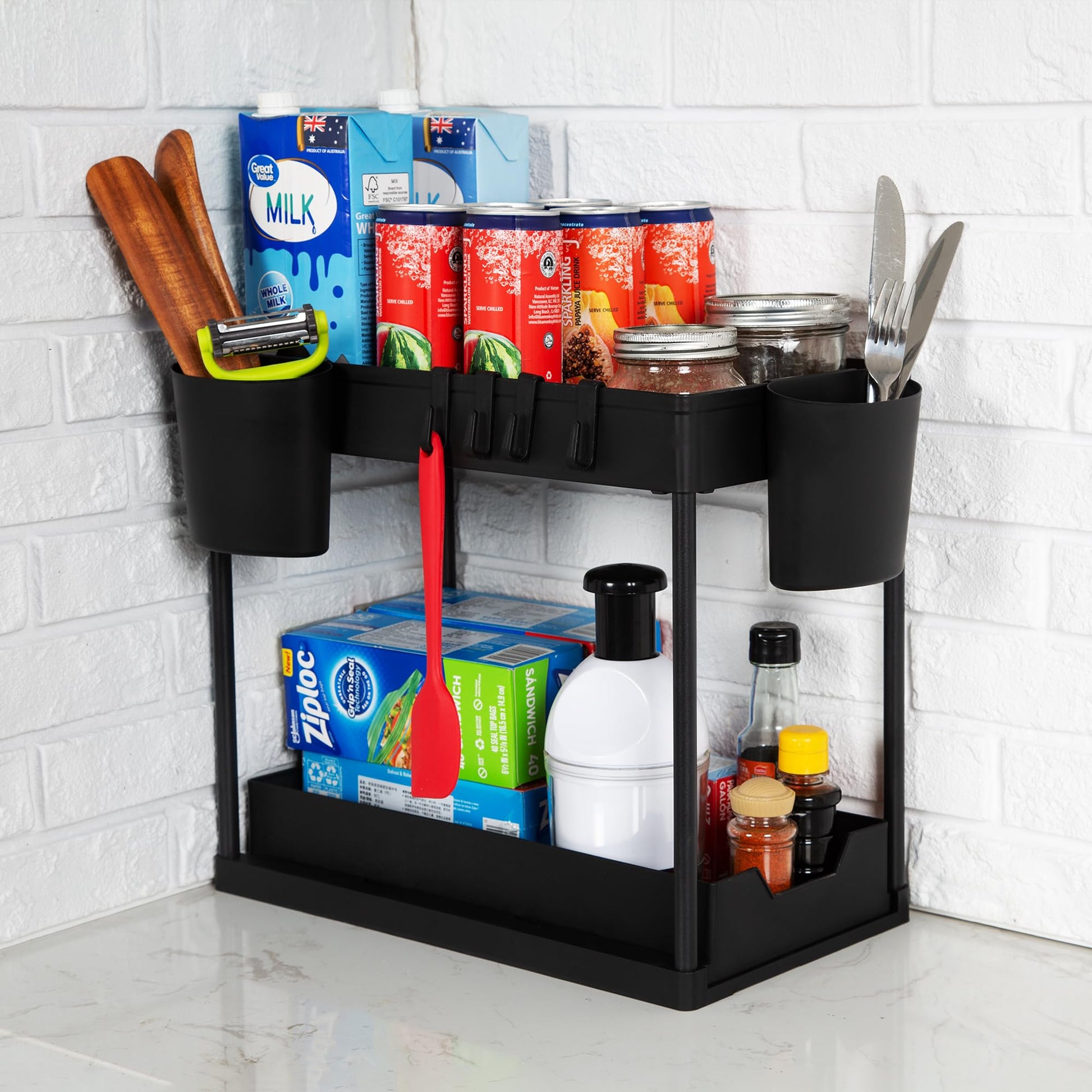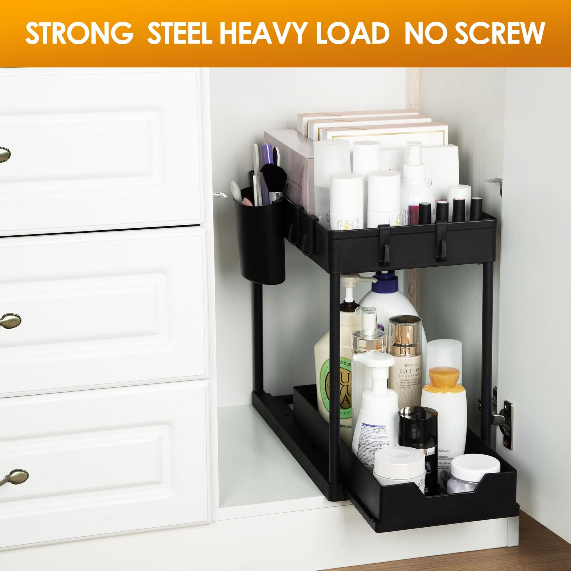 2 Tier Under Sink Storage, Black Under Sink Storage Shelf with Bottom Sliding Basket Drawer,4 Hooks, 2 Hanging Cup, Slim Under Sink Organizer for Kitchen, Bathroom,(Black)