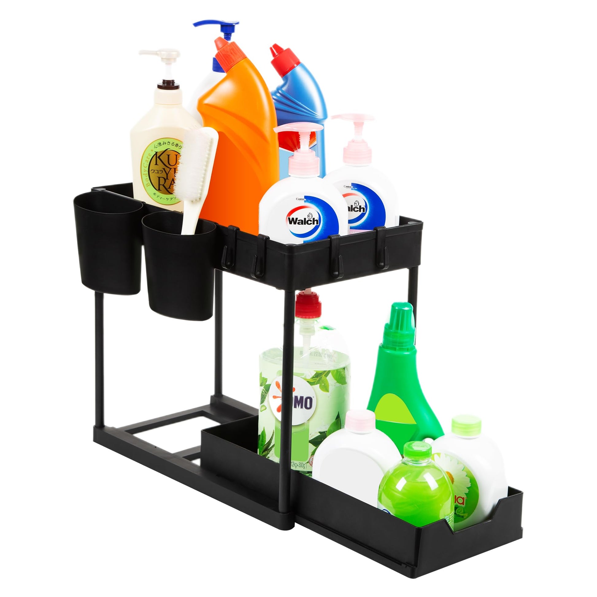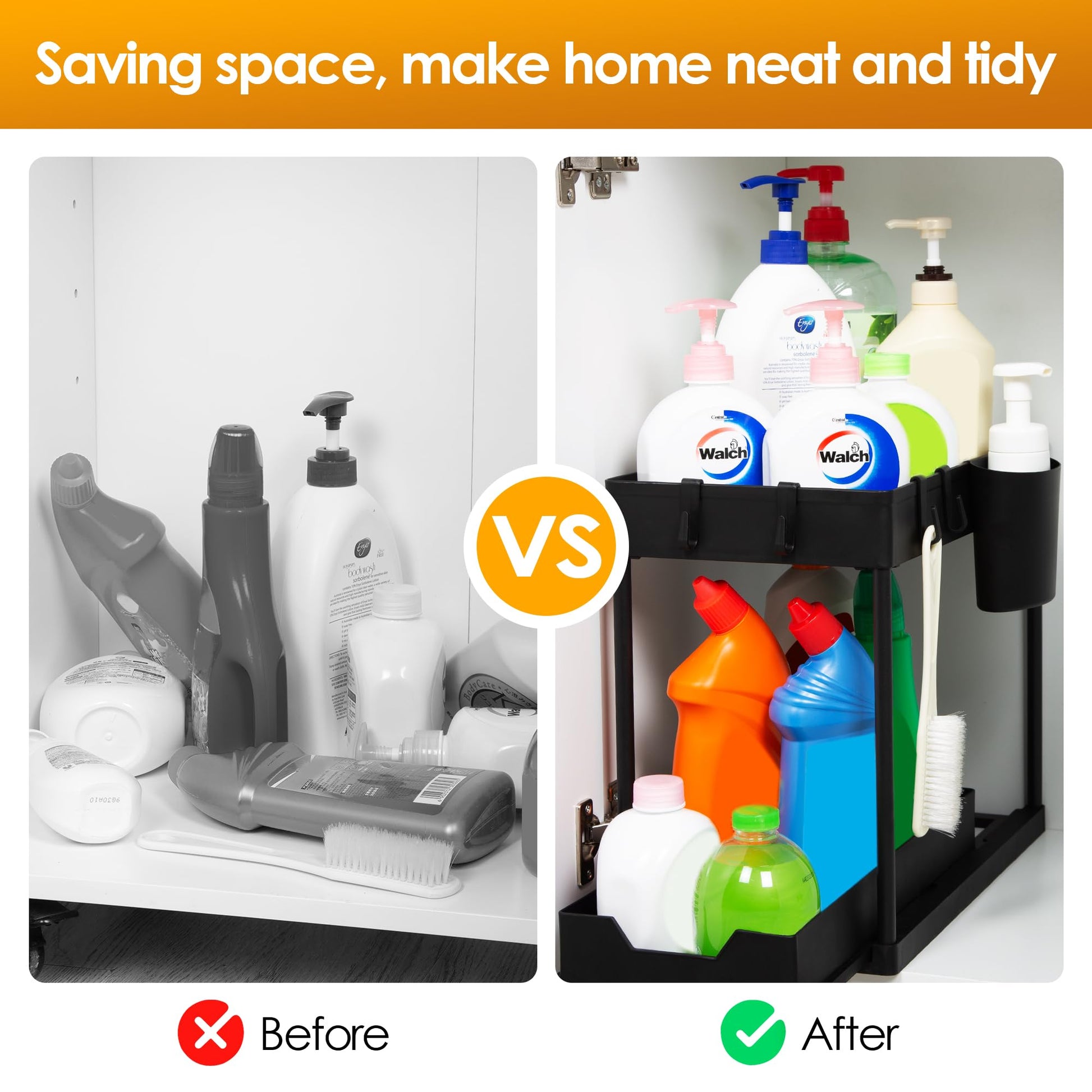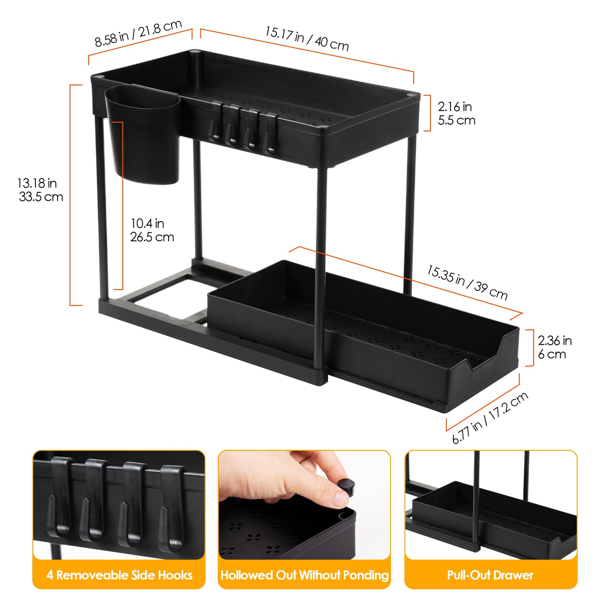 - Maximizes Under-Sink Storage Space: The 2-tier black under-sink storage shelf with a bottom sliding basket drawer and 4 hooks provide ample space to store and organize your cleaning supplies, toiletries, and other items that would otherwise clutter the area under your sink. This smart storage solution can help you maximize the storage space available in your bathroom, kitchen, or laundry room.